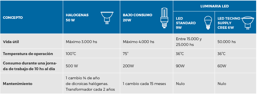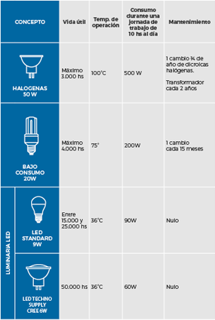 • Ahorro: consumen en promedio un 80% menos que las lámparas halógenas y hasta un 50% menos que las de bajo consumo. Reduce el consumo de aire acondicionado gracias a su baja temperatura operativa.